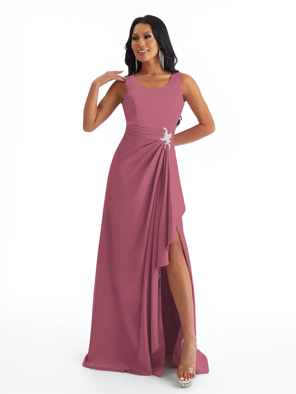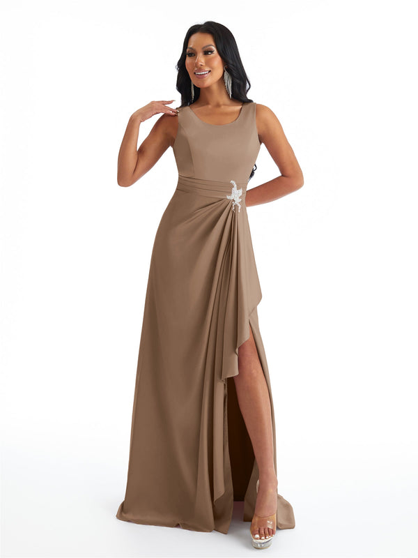 Elegant Scoop Side Slit Lace Applique A-Line Pleated Satin Pretty Long Bridesmaid Dresses - ChicSew