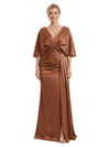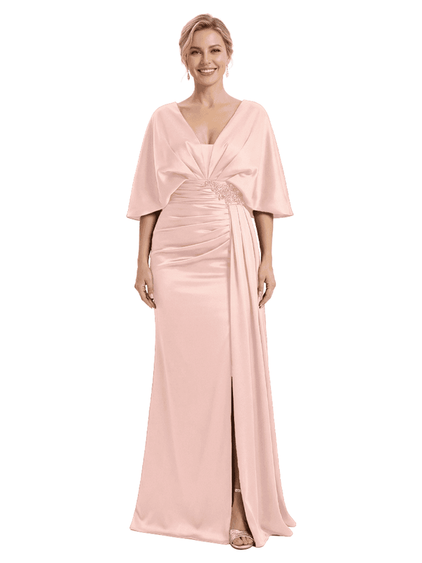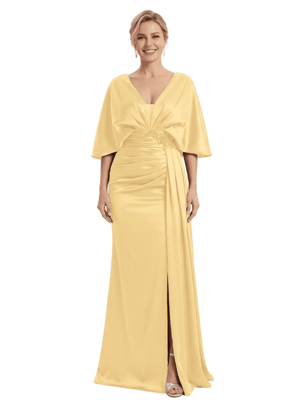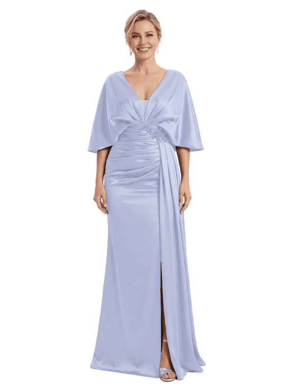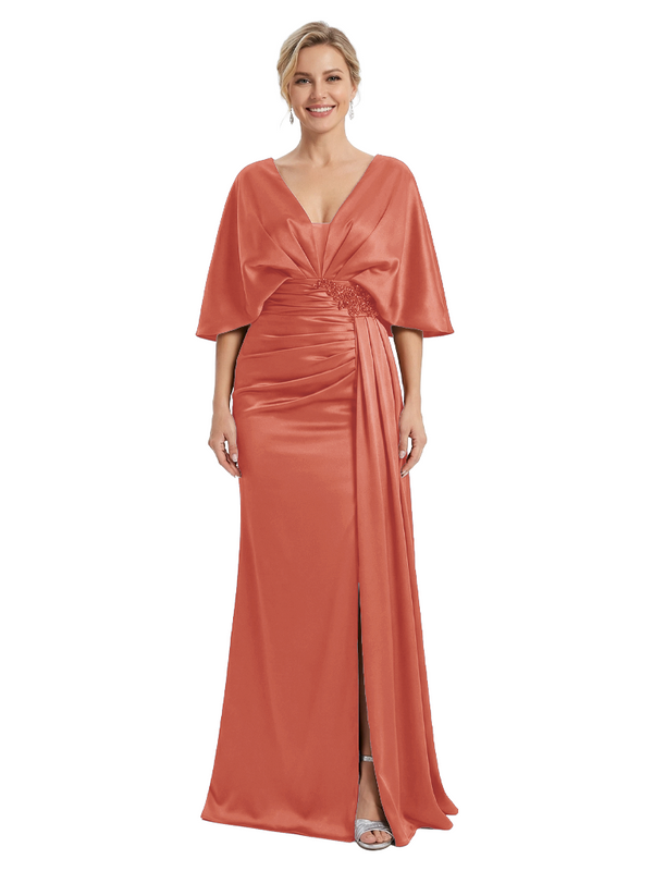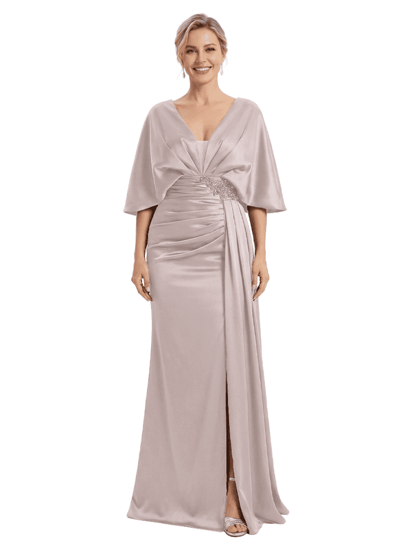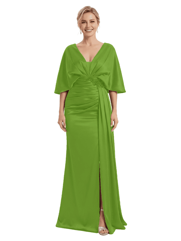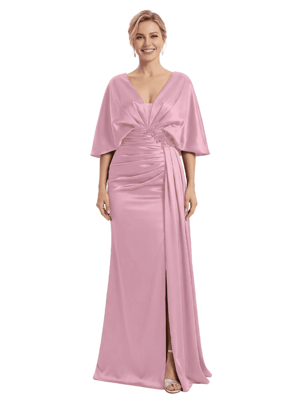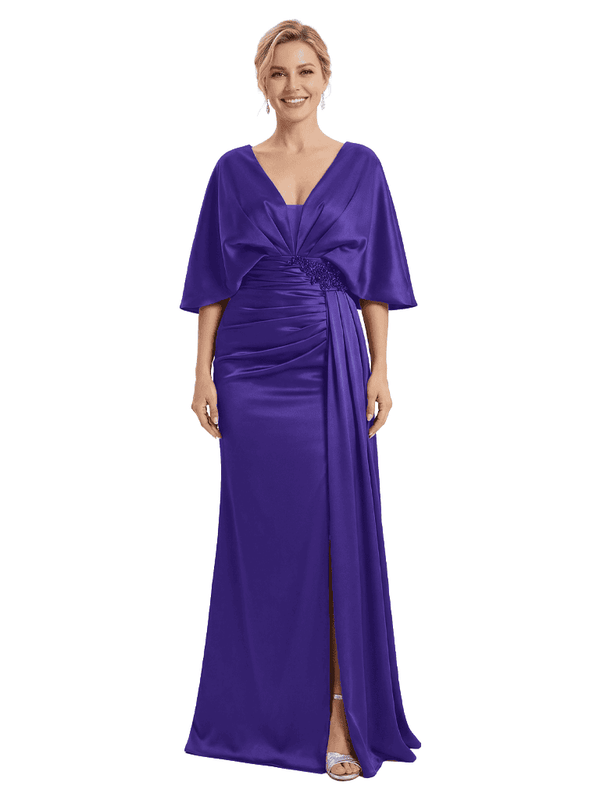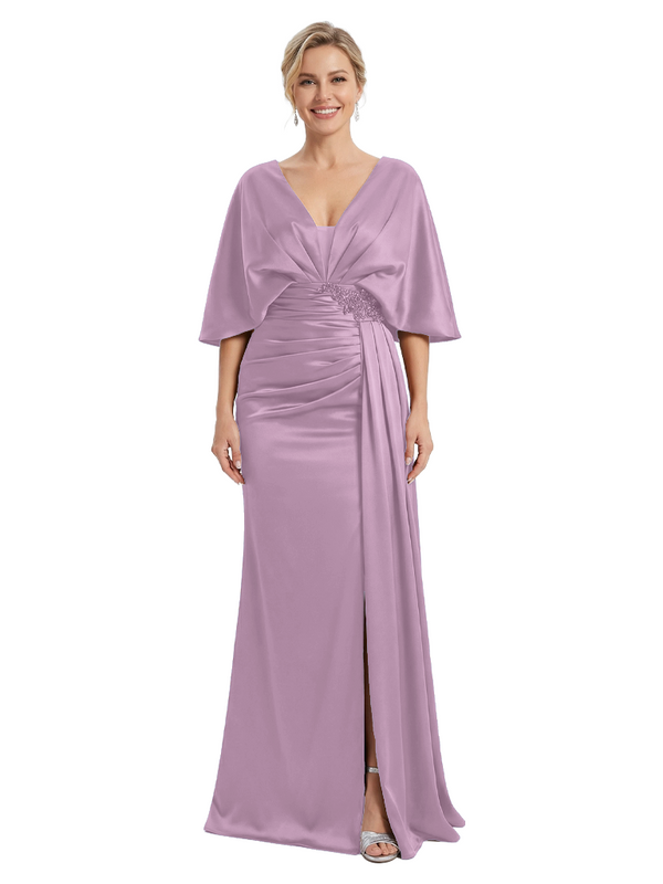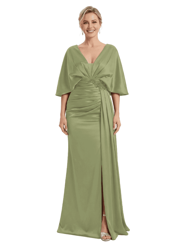 Mother of The Bride Dress V-Neck Cape Sleeve Satin Ruched Mermaid Floor-Length Gown Wedding Guest Formal Wear