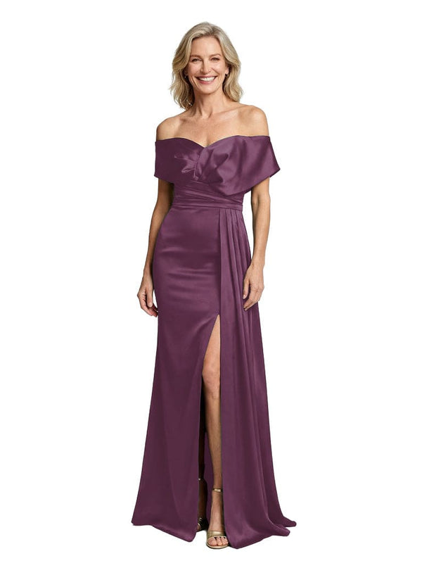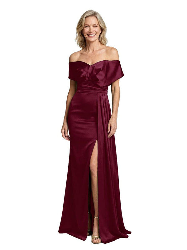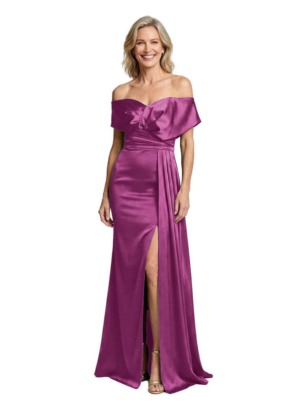 Mother Of The Bride Off Shoulder Satin Mermaid Ruched Formal Bride Mother Wear With Side Slit - Chicsew