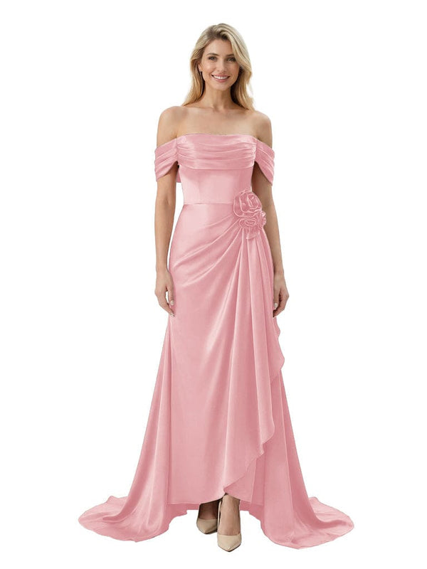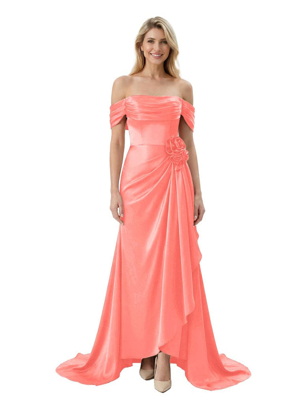Off The Shoulder Ruching Satin Mother Of The Groom Dress Mermaid Maxi Gown With Floral Accent Train £102.99