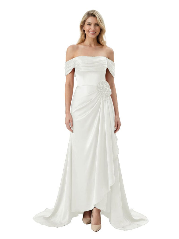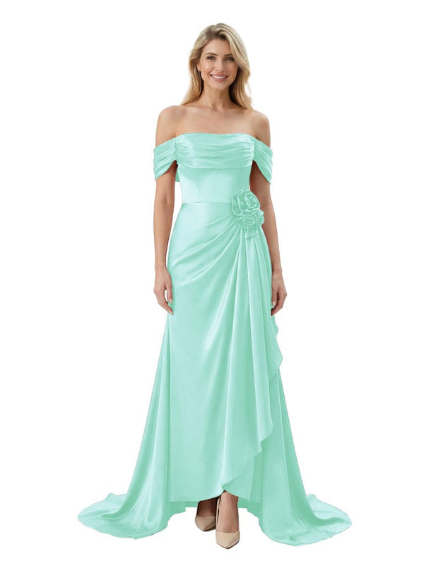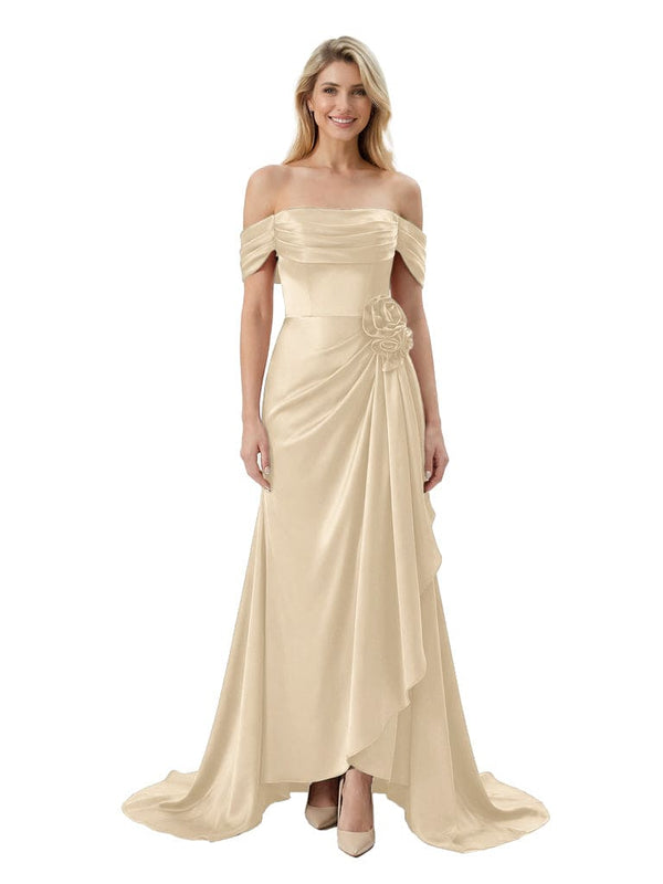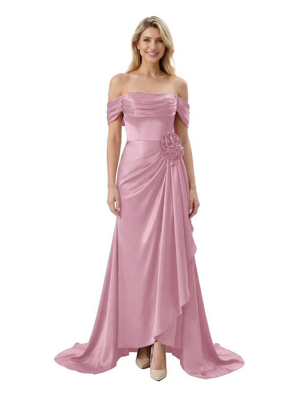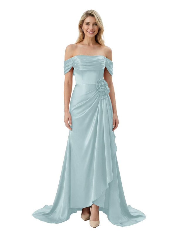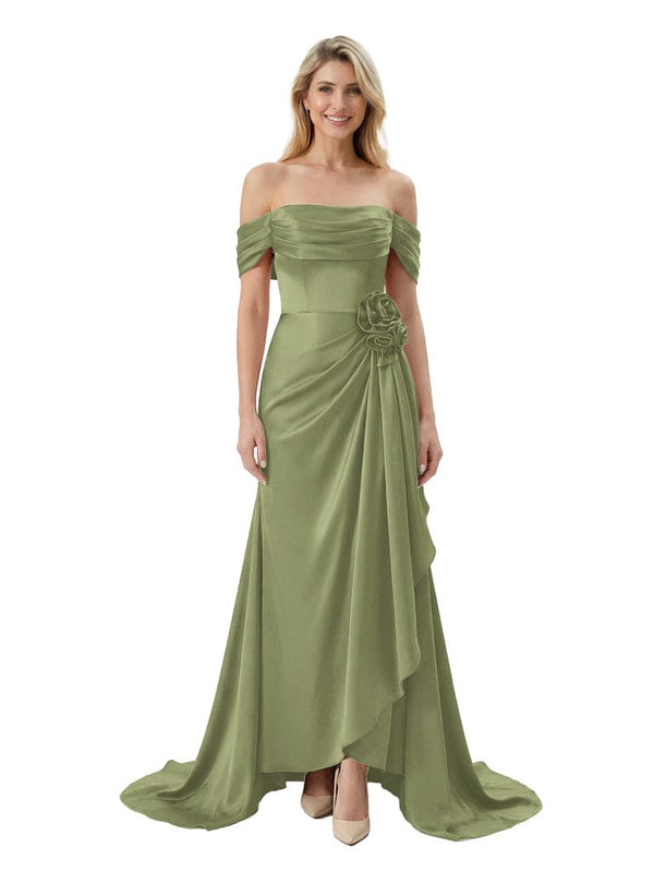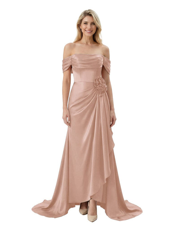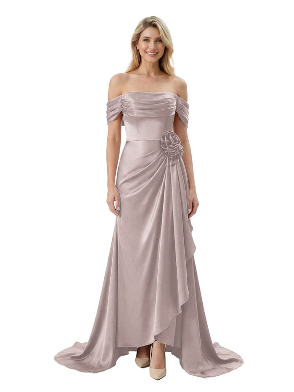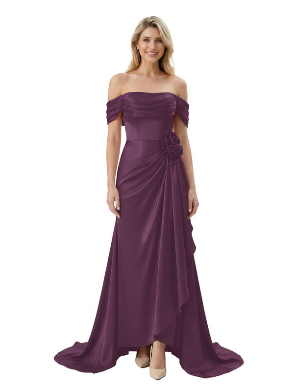 Off The Shoulder Ruching Satin Mother Of The Groom Dress Mermaid Maxi Gown With Floral Accent Train - Chicsew
