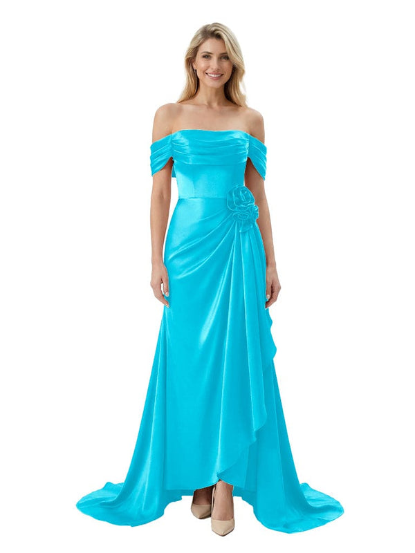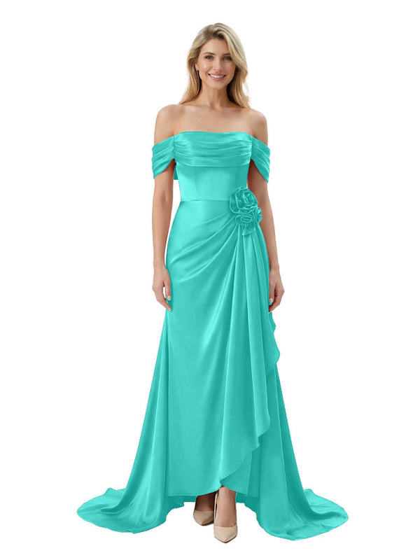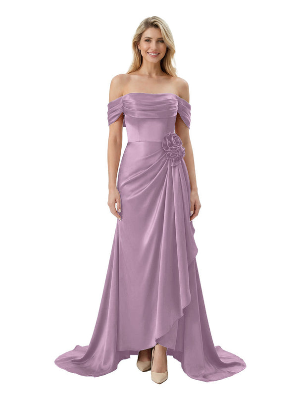Off The Shoulder Ruching Satin Mother Of The Groom Dress Mermaid Maxi Gown With Floral Accent Train
