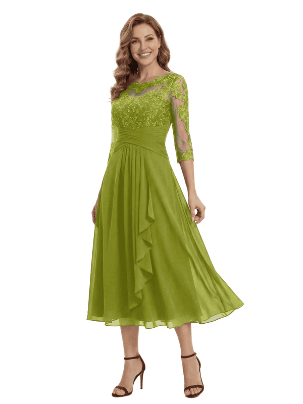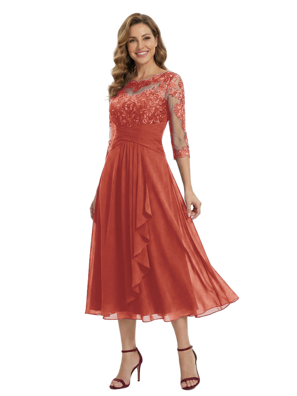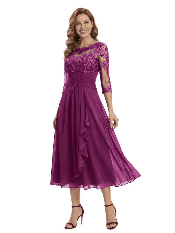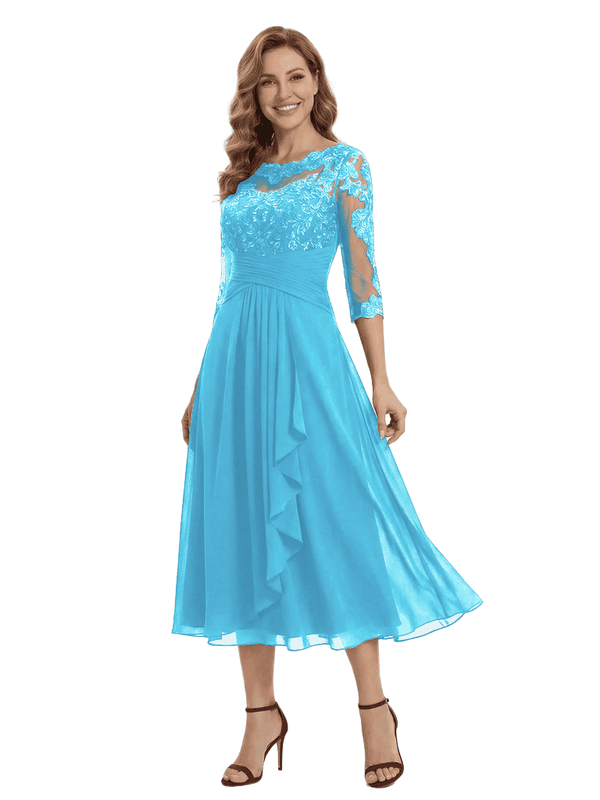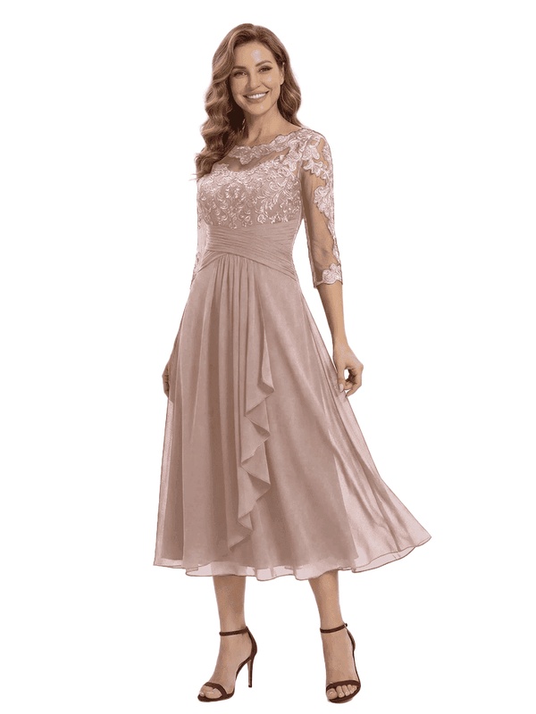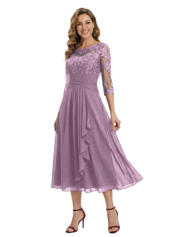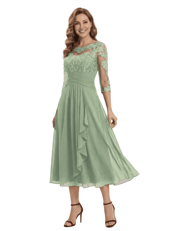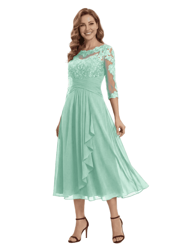 Pretty Scoop Neck 3/4 Sleeve Lace Chiffon Mother of The Groom Dress Tea-Length A-Line Gown with Ruffle Trim Graceful Wedding Celebration Dress - ChicSew