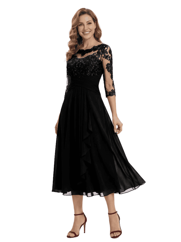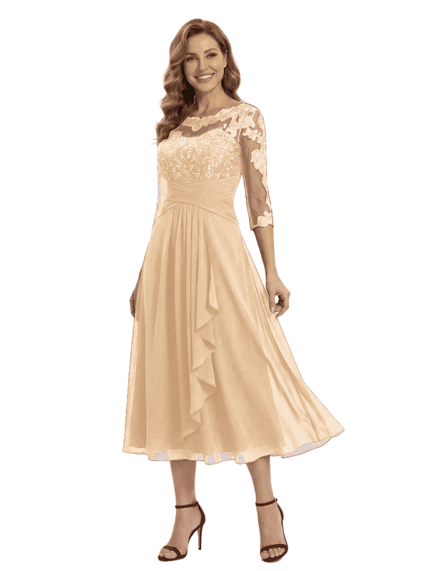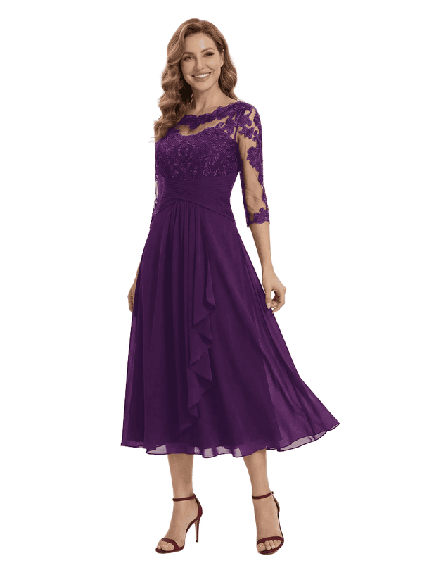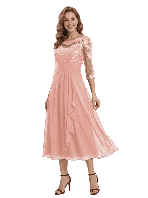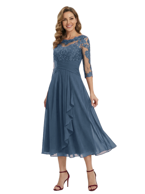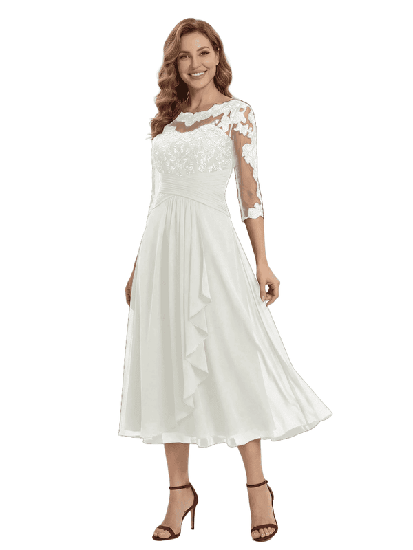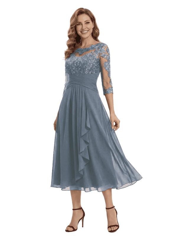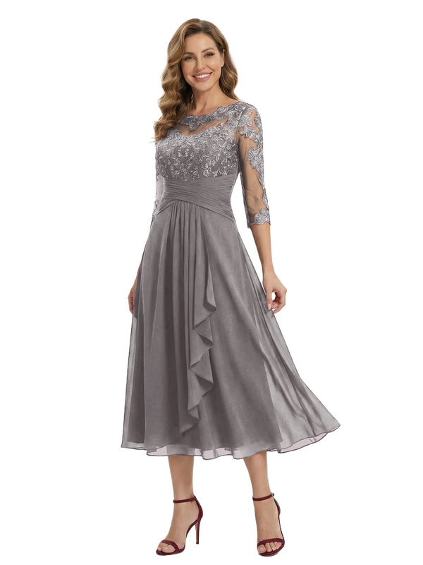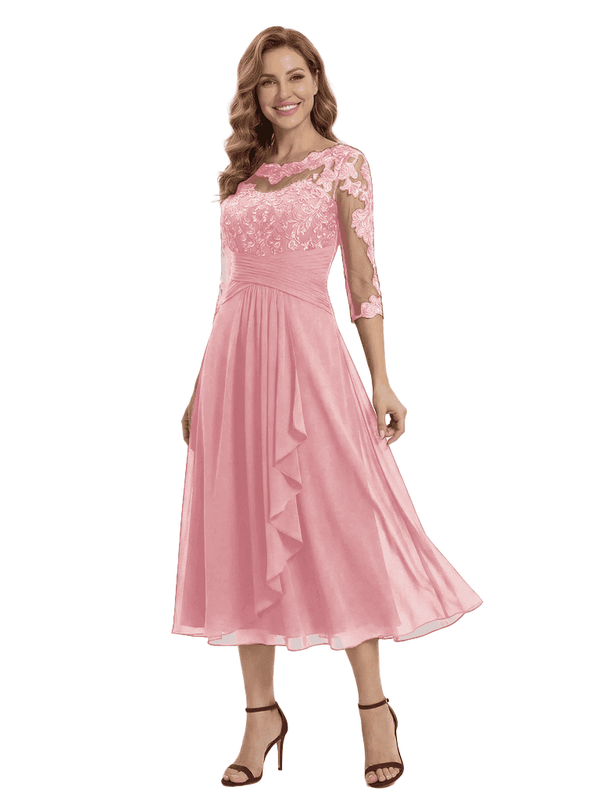 Pretty Scoop Neck 3/4 Sleeve Lace Chiffon Mother of The Groom Dress Tea-Length A-Line Gown with Ruffle Trim Graceful Wedding Celebration Dress - ChicSew