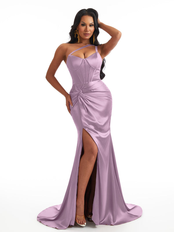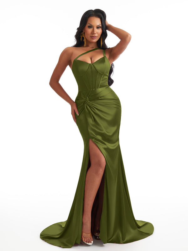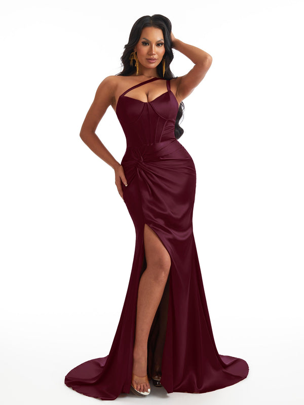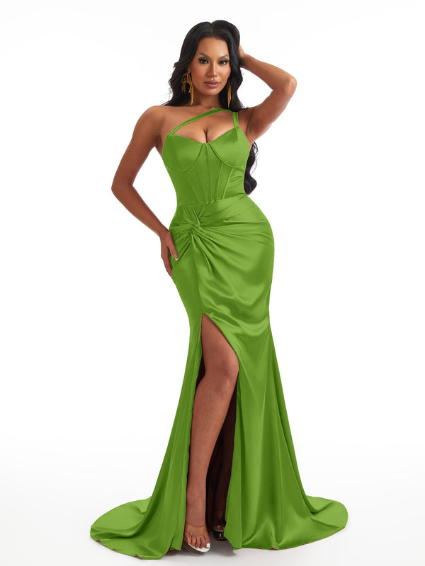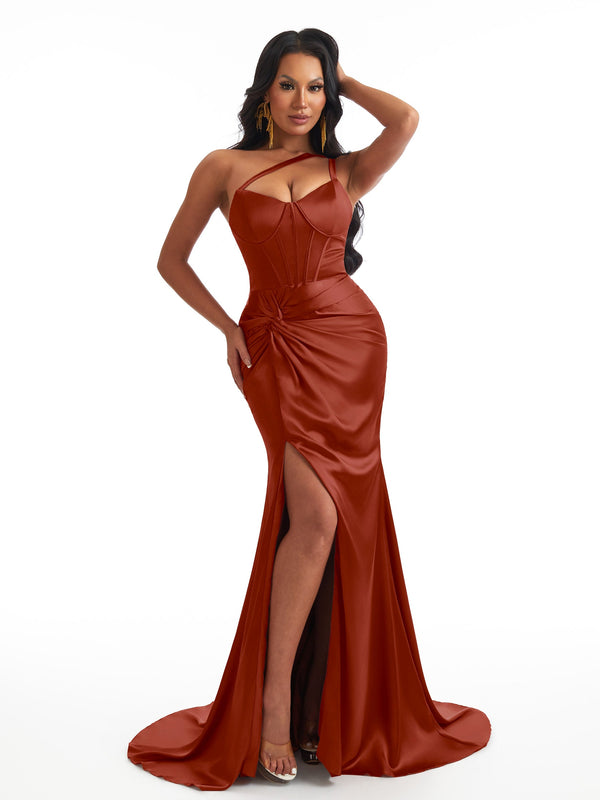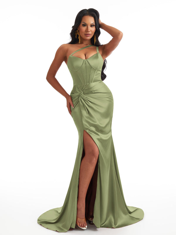 Sexy One Shoulder Mermaid Soft Satin Boning Side Slit Unique Long Bridesmaid Dresses - ChicSew