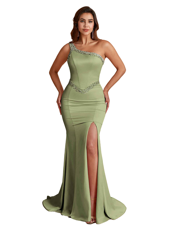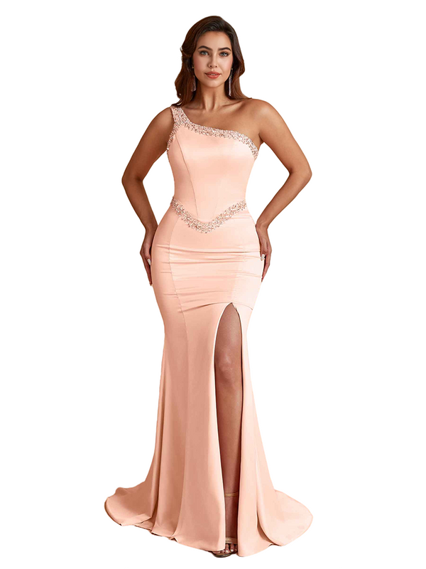 Sexy One Shoulder Mermaid Silky Satin Beaded Long Bridesmaid Dresses Side Slit