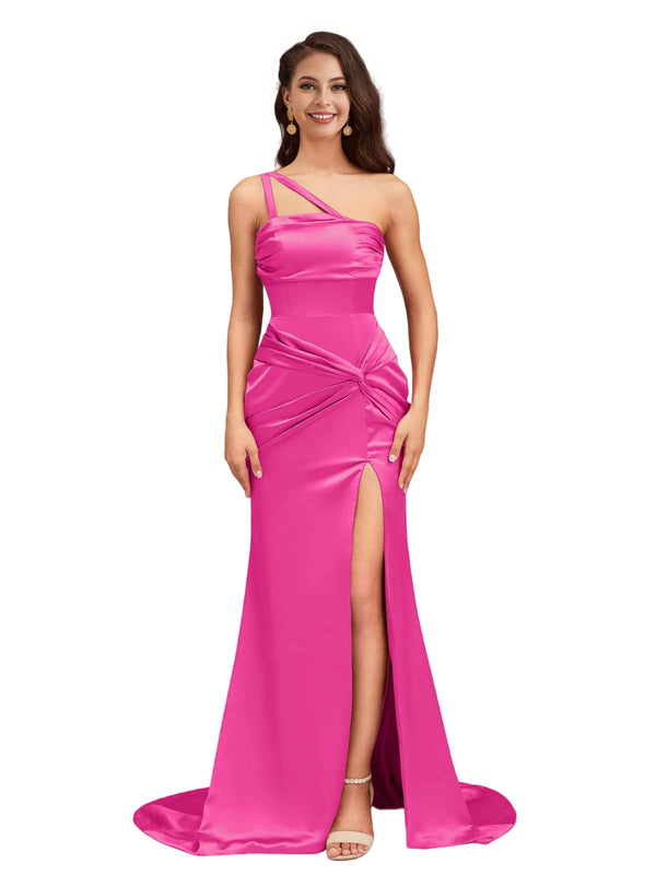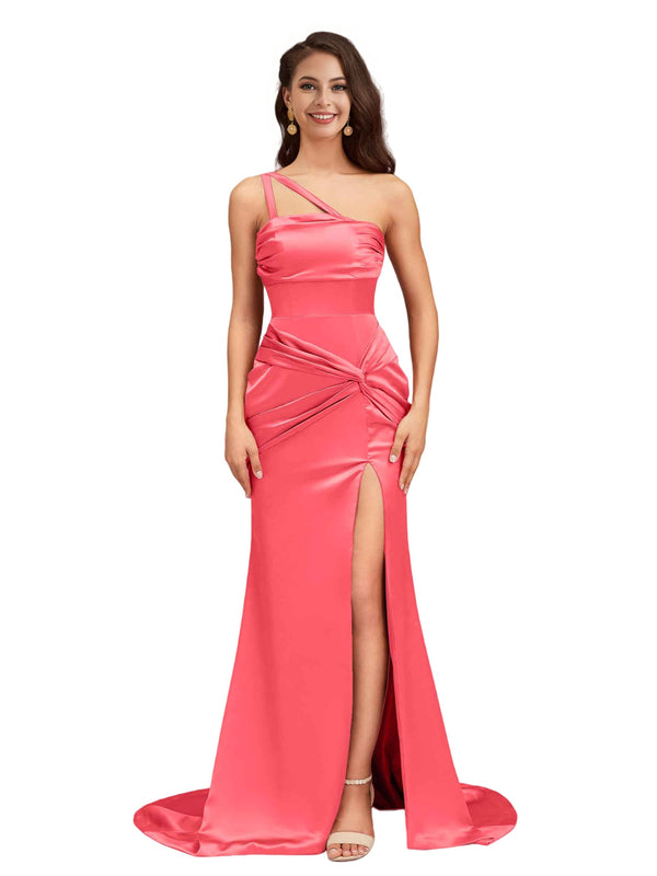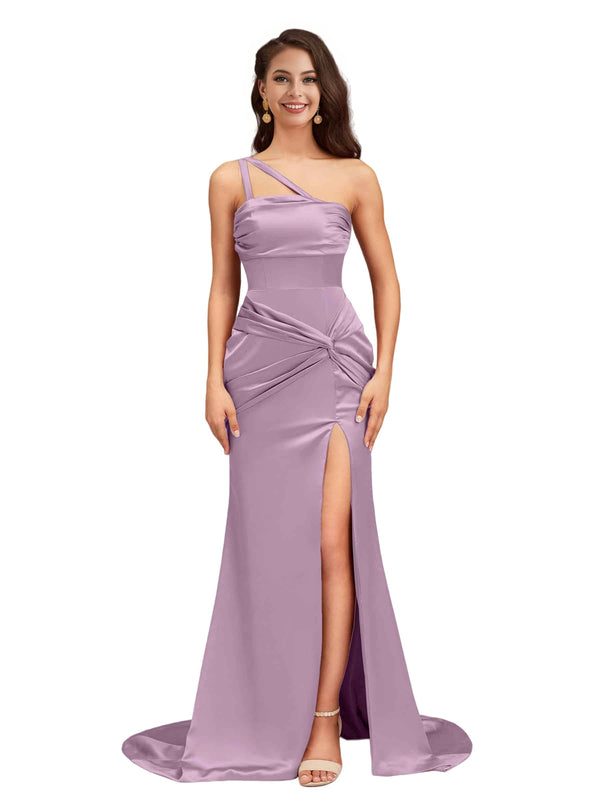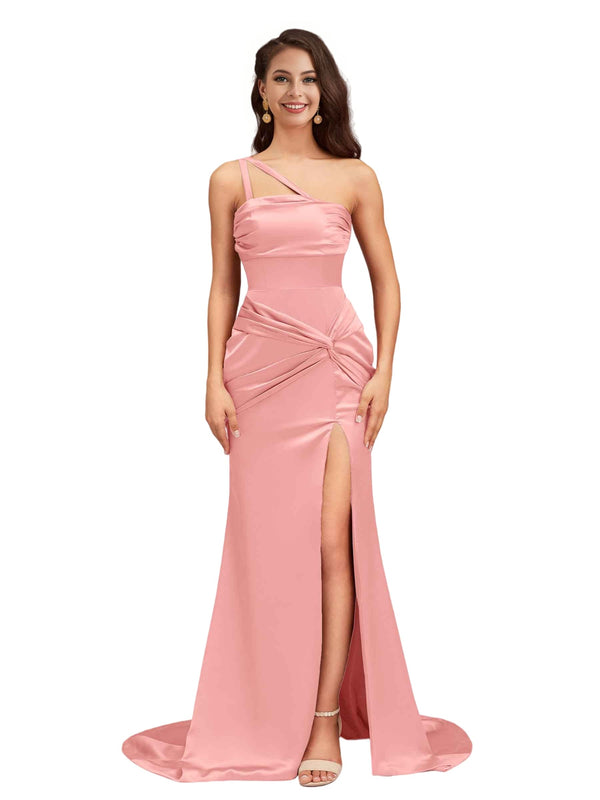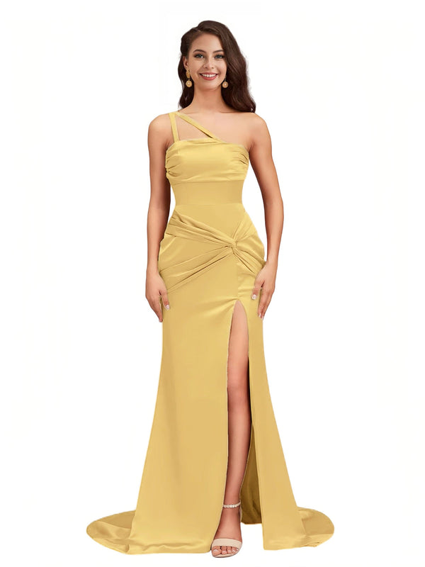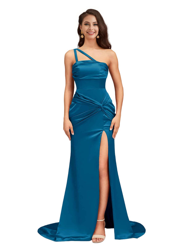 Sexy Side Slit One Shoulder Mermaid Long Soft Satin Bridesmaid Dresses