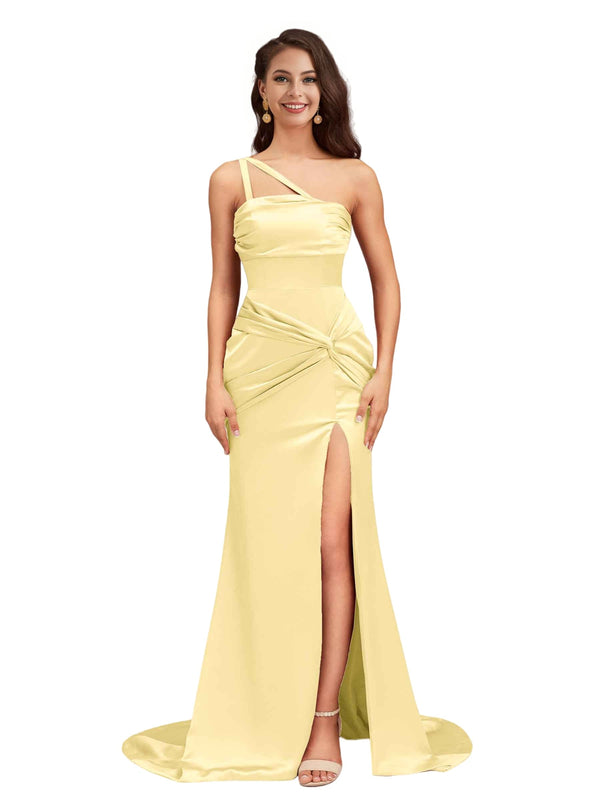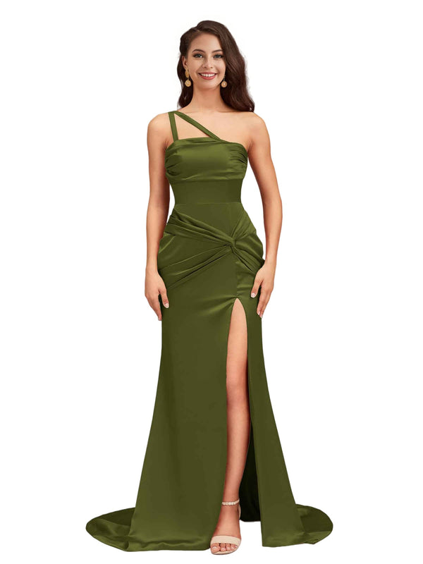 Sexy Side Slit One Shoulder Mermaid Long Soft Satin Bridesmaid Dresses - ChicSew