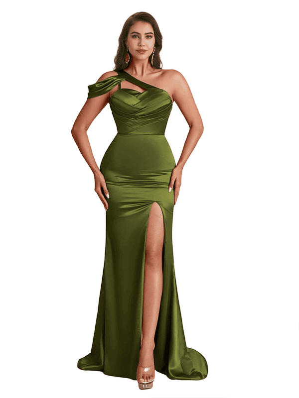 Sexy Silky Satin One Shoulder Mermaid Side Slit Long Bridesmaid Dresses Online