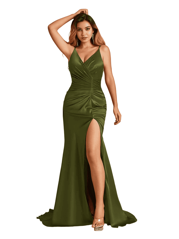 Sexy Spaghetti Straps Open Back Mermaid Side Slit Satin Long Bridesmaid Dresses