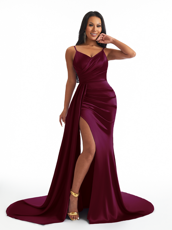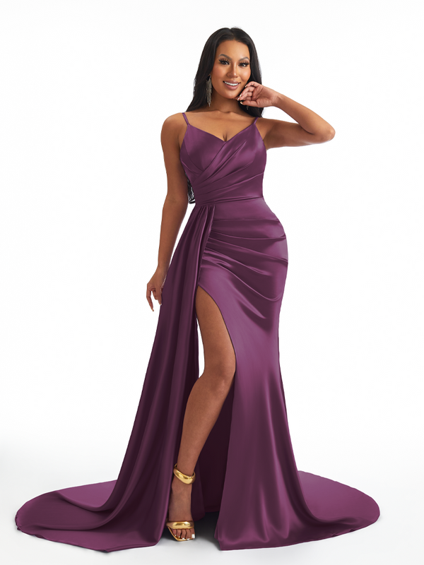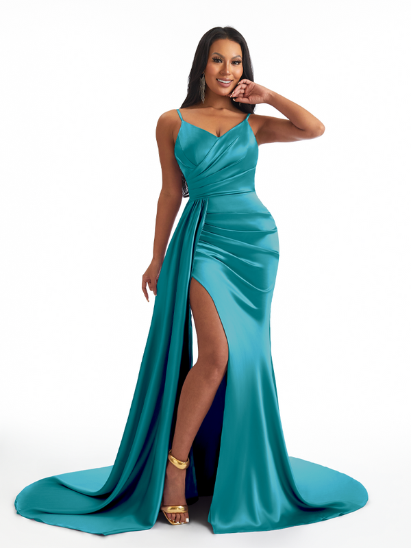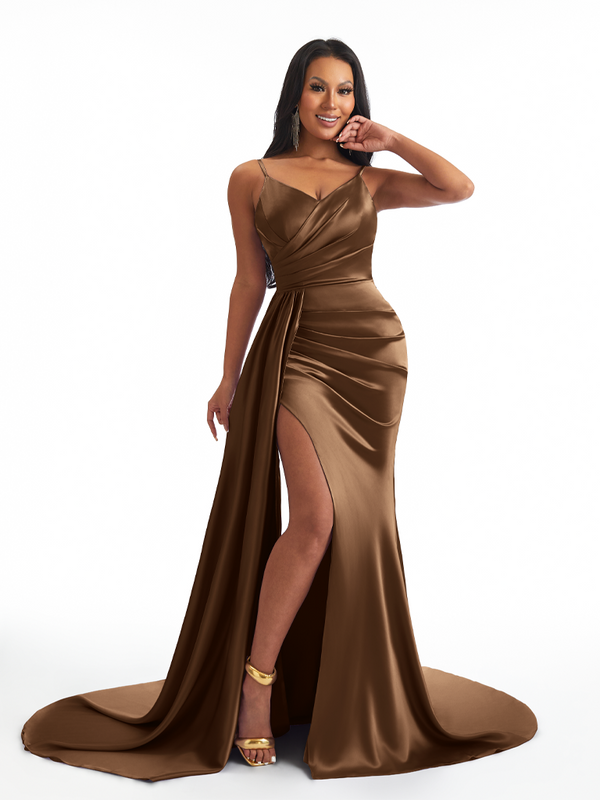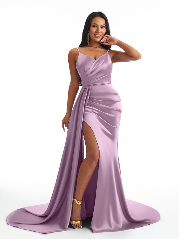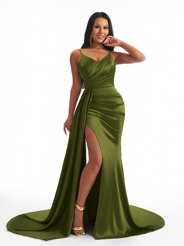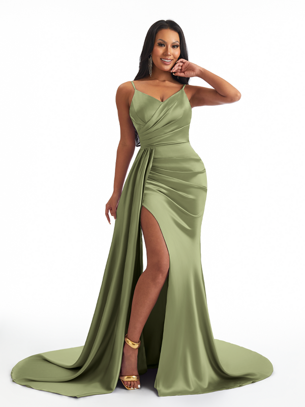 Sexy Spaghetti Straps Side Slit Mermaid Soft Satin Long Bridesmaid Dresses - ChicSew
