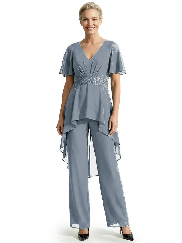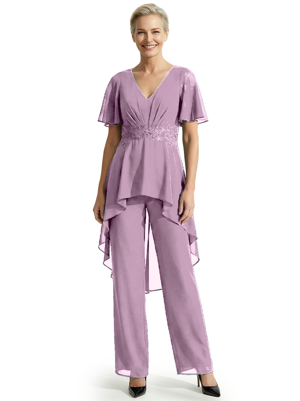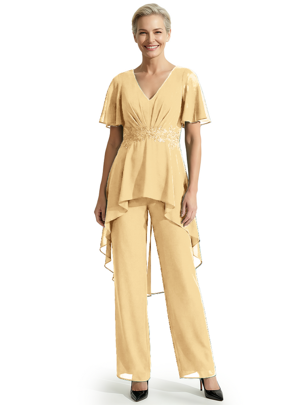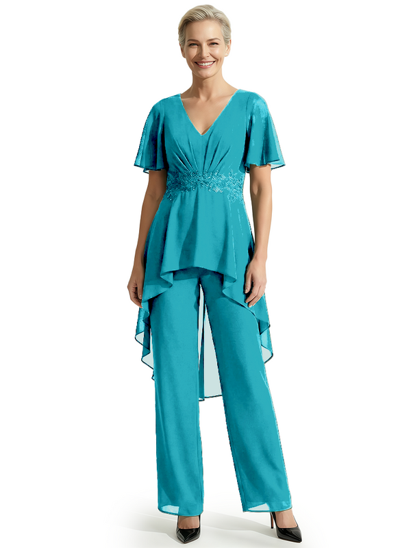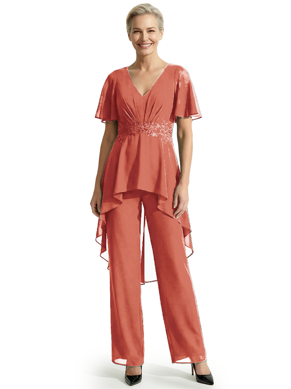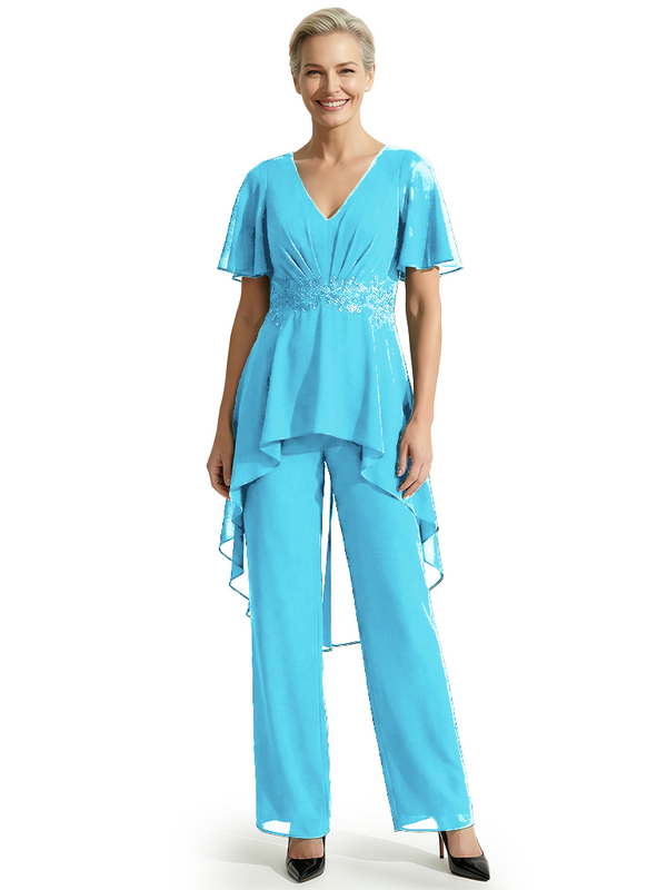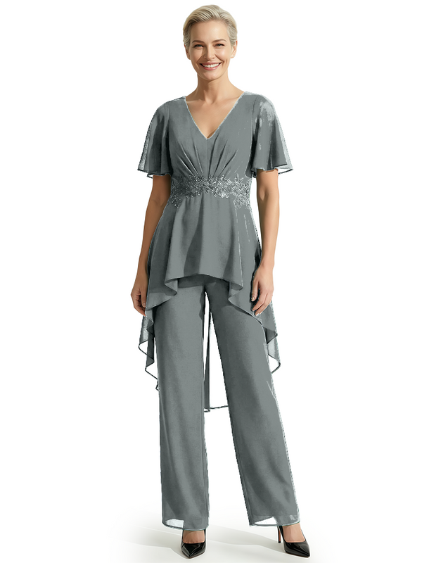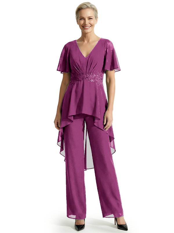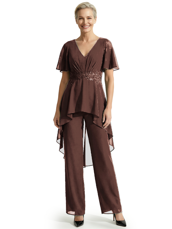 Unique V-Neck Chiffon Mother Of The Bride Pant Suit With Flutter Sleeves - ChicSew