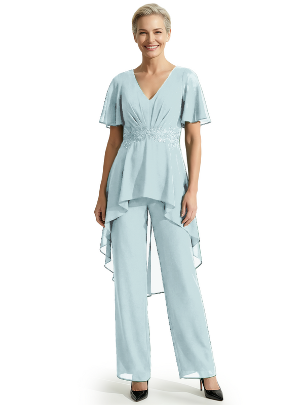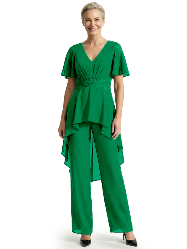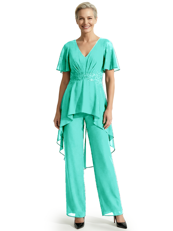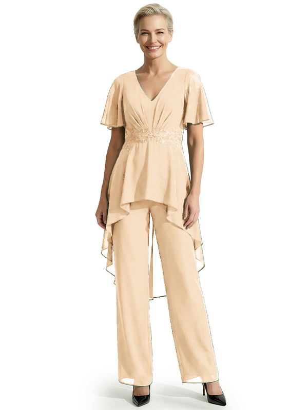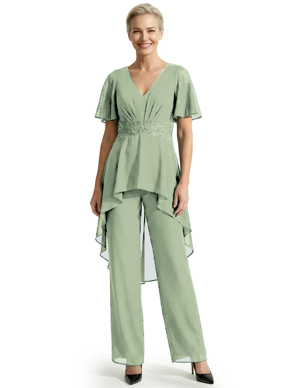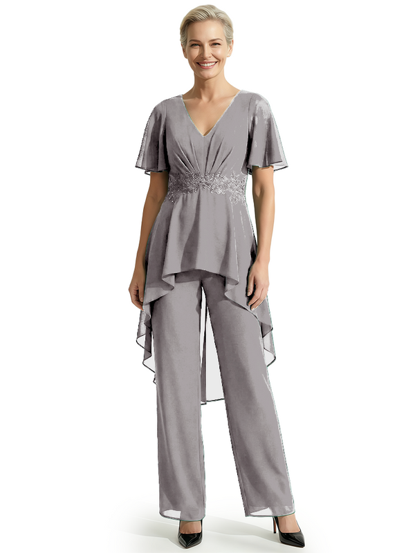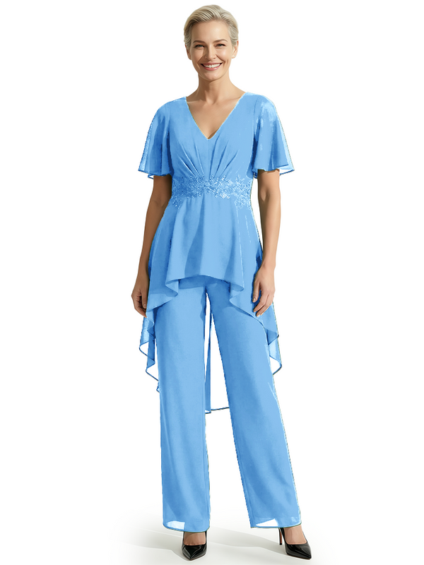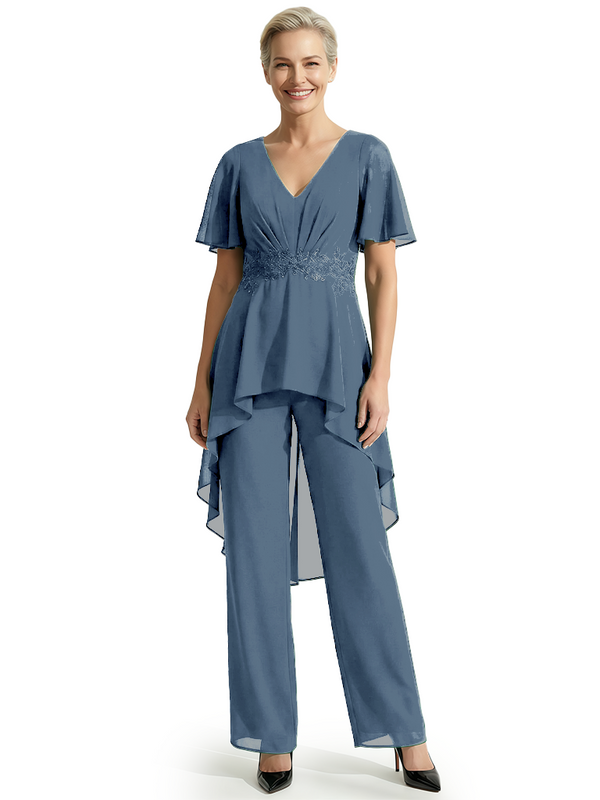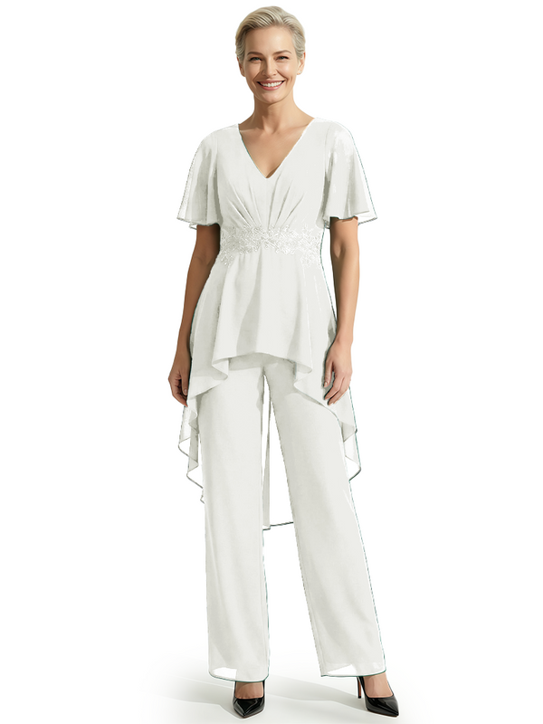 Unique V-Neck Chiffon Mother Of The Bride Pant Suit With Flutter Sleeves - ChicSew