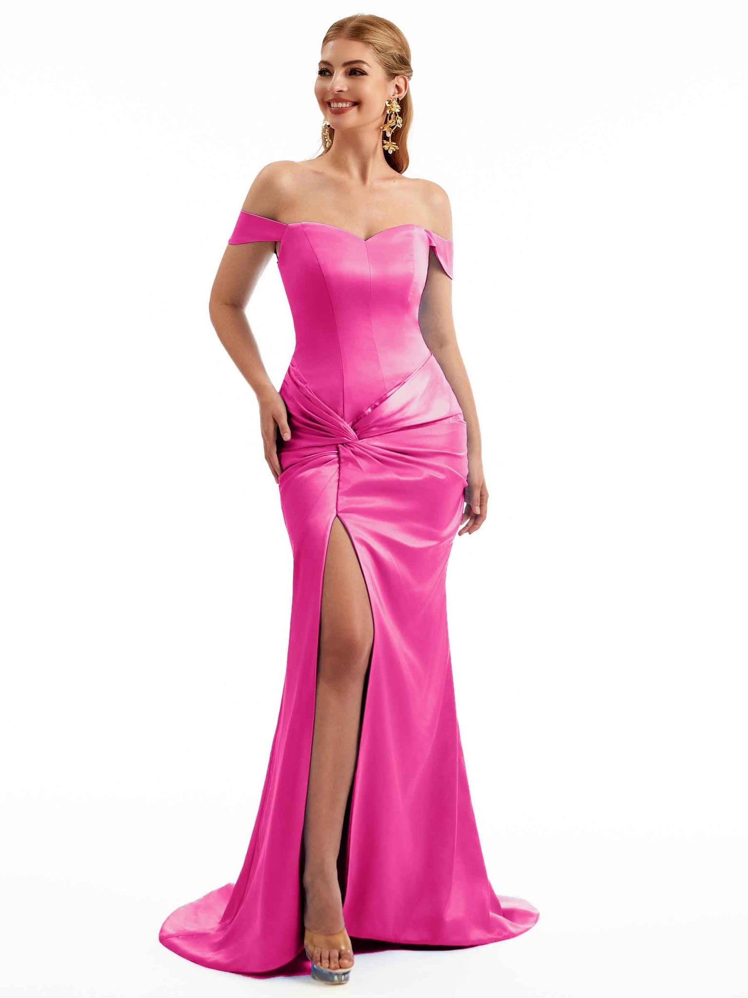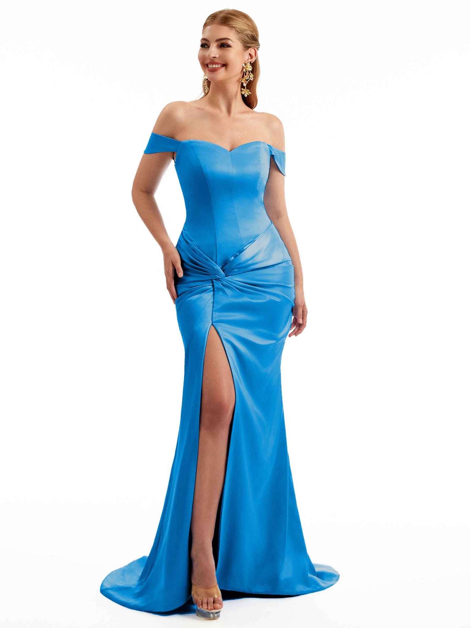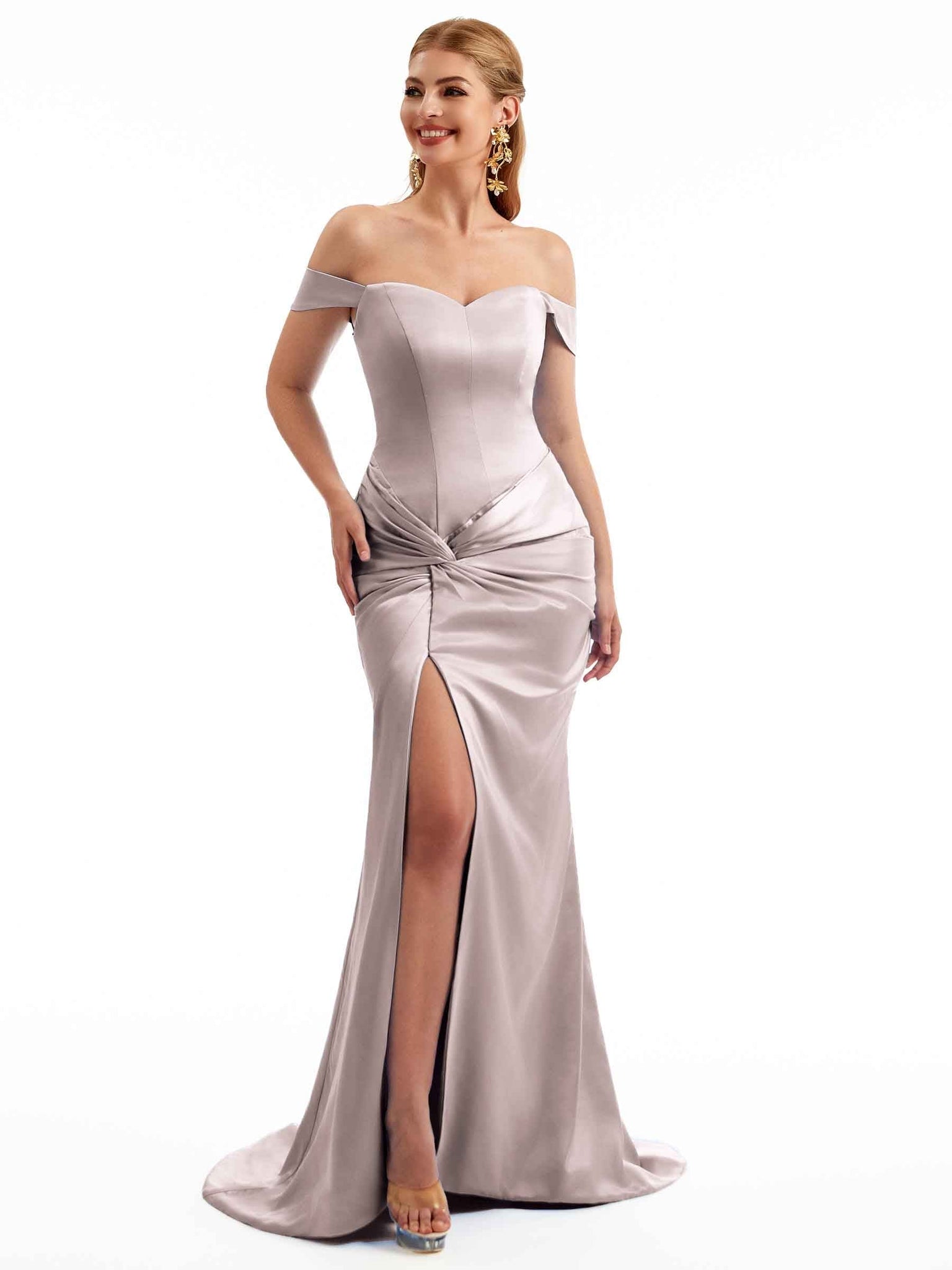 Women Side Split Off The Shoulder Long Boho Chic Satin Bridesmaid Dresses Online £108.99