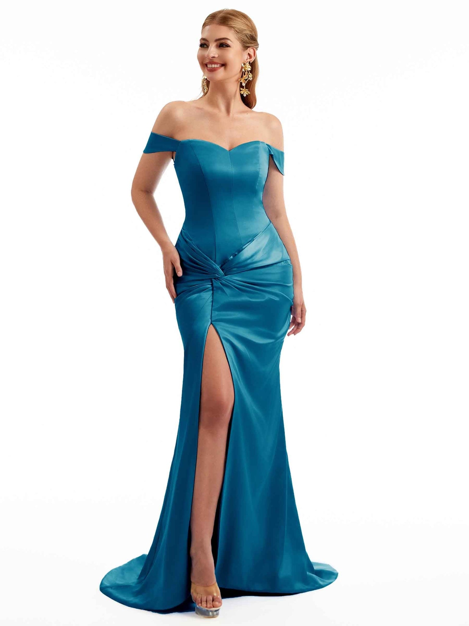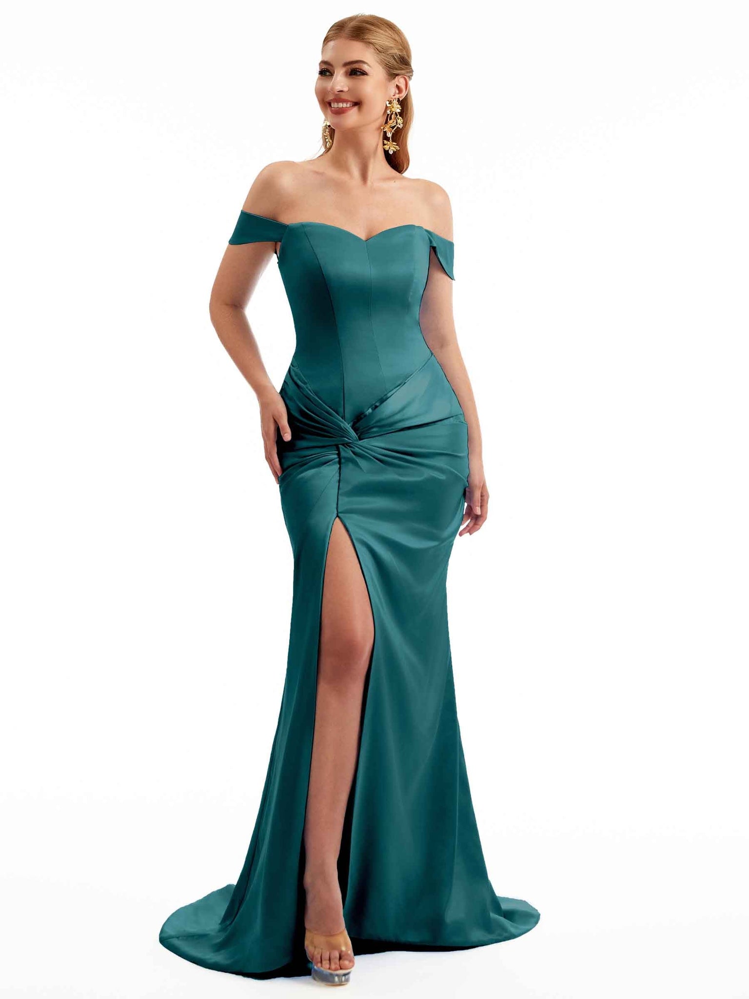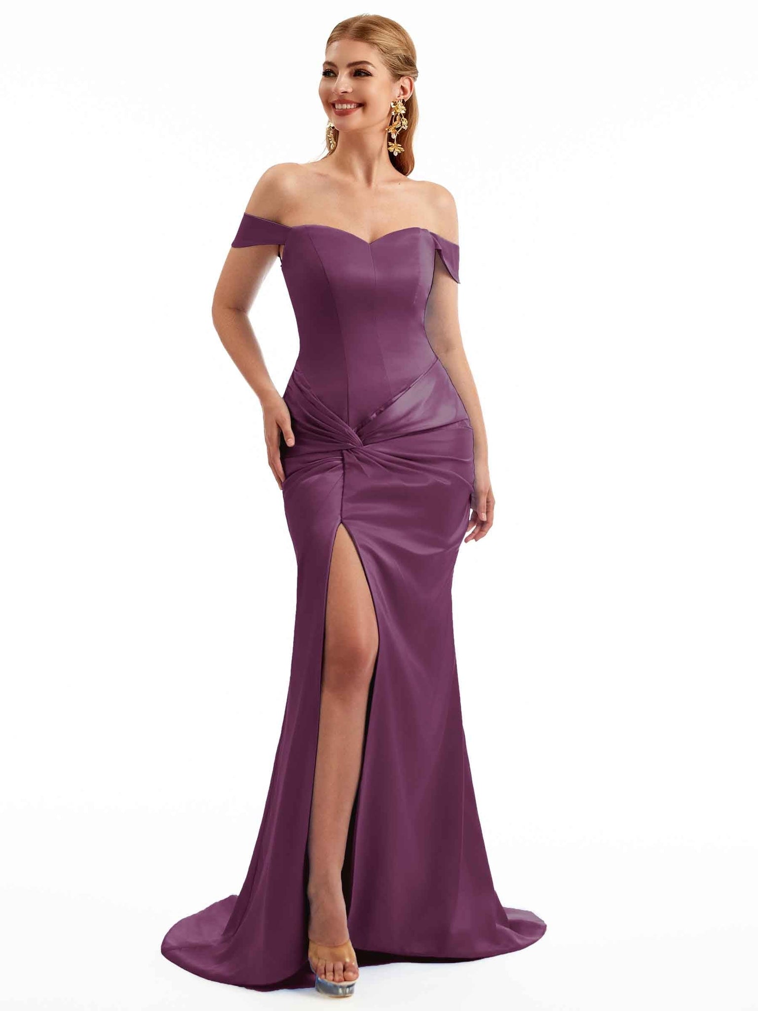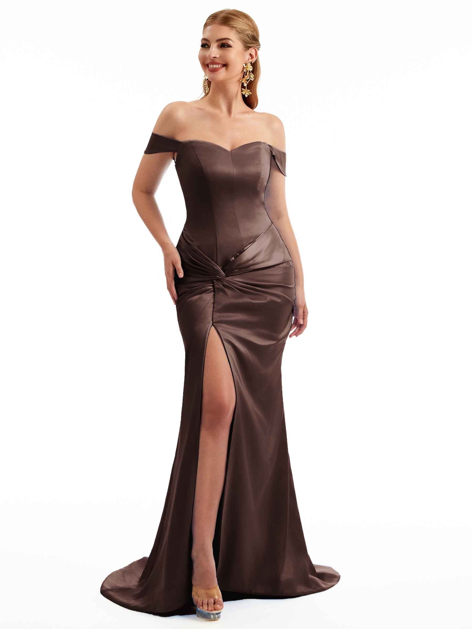 Women Side Split Off The Shoulder Long Boho Chic Satin Bridesmaid Dresses Online