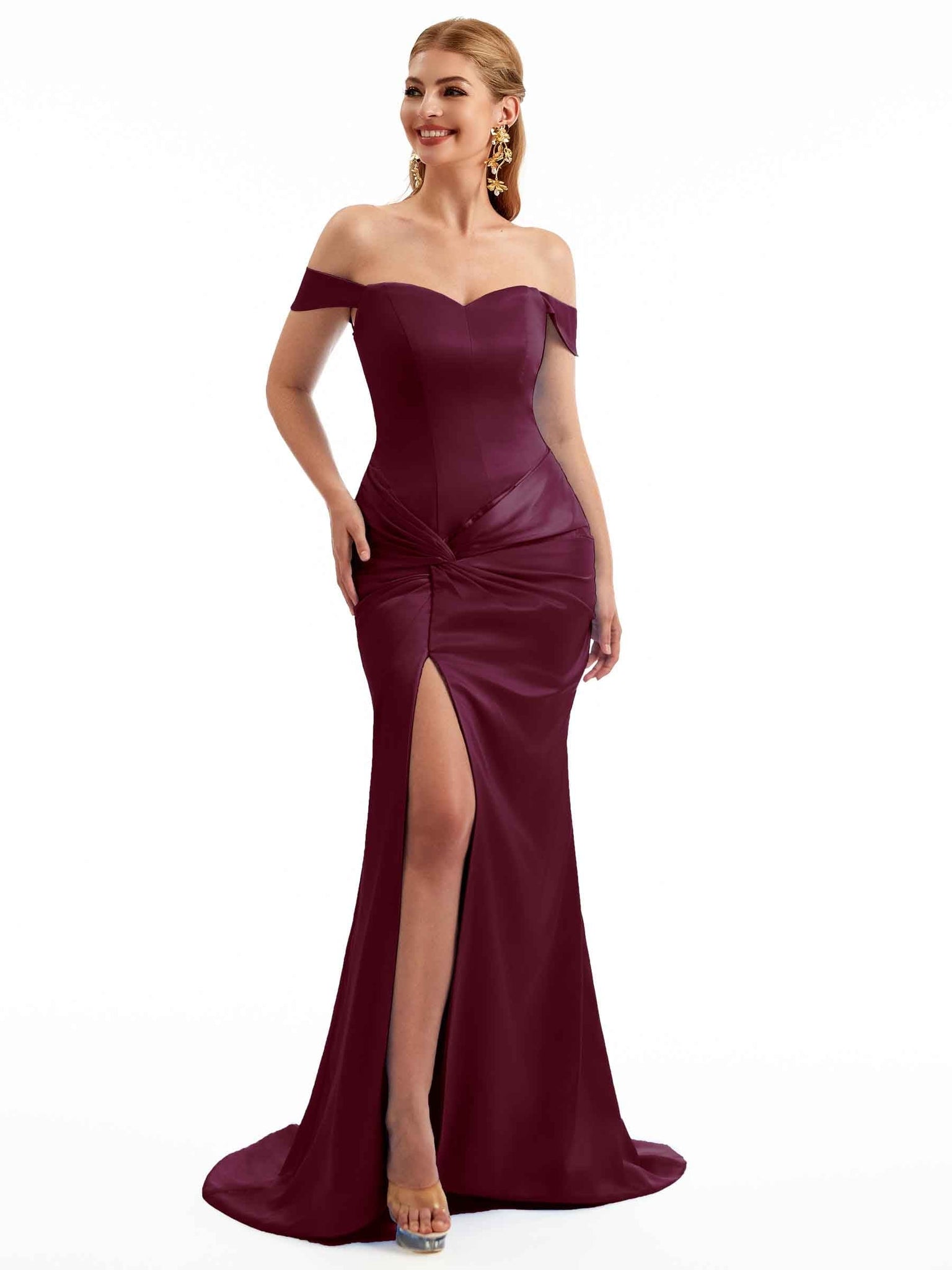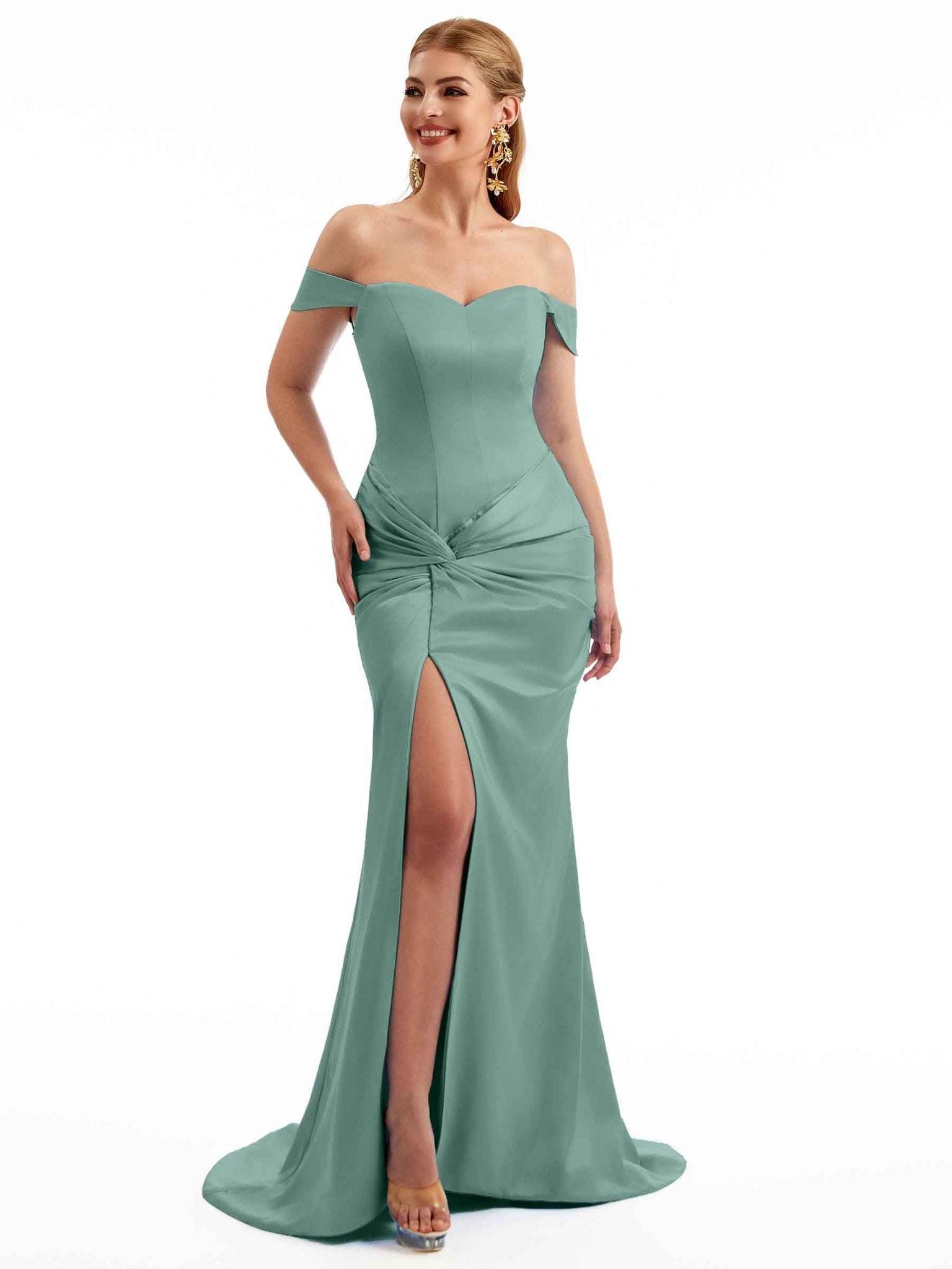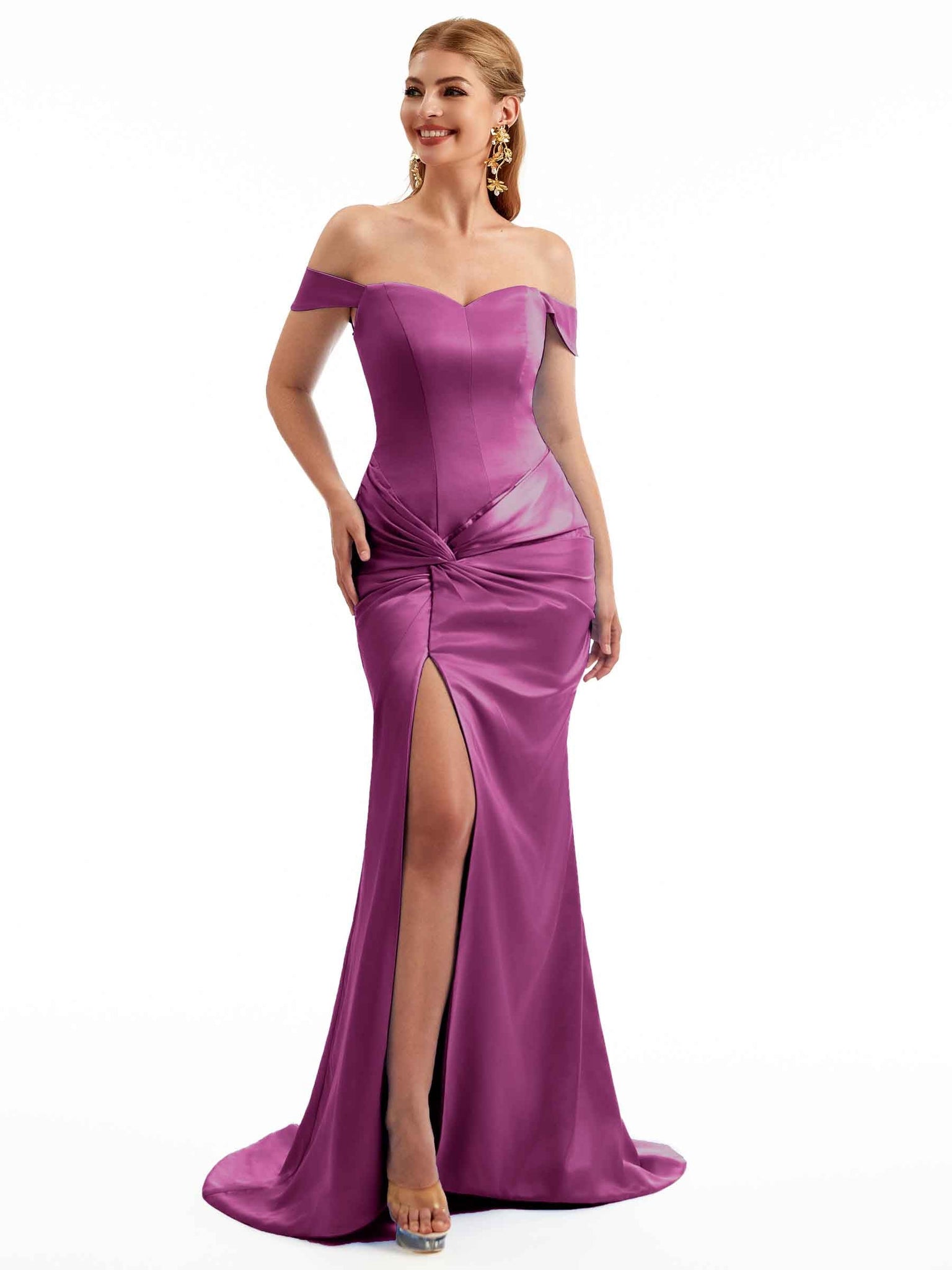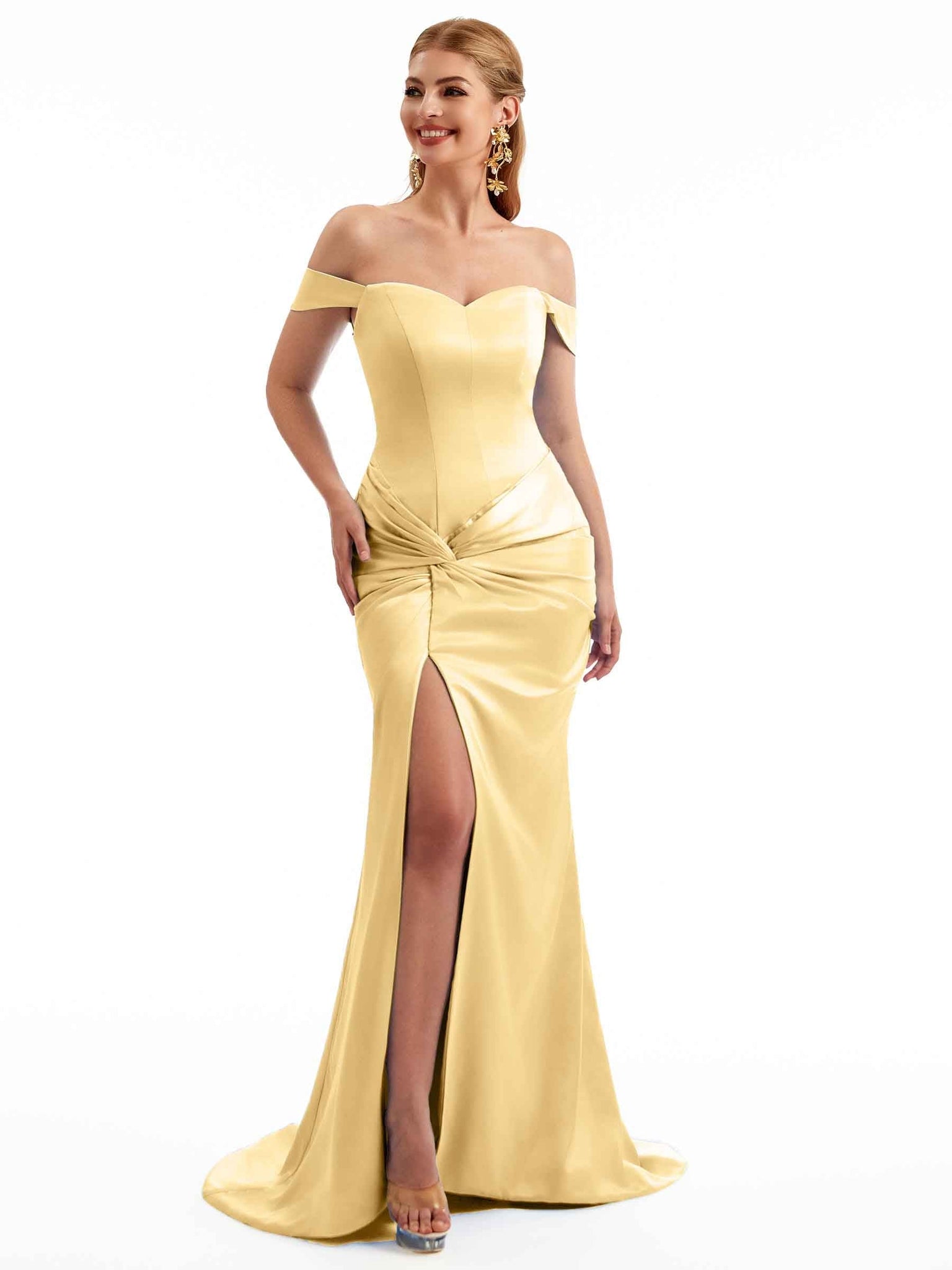 Women Side Split Off The Shoulder Long Boho Chic Satin Bridesmaid Dresses Online