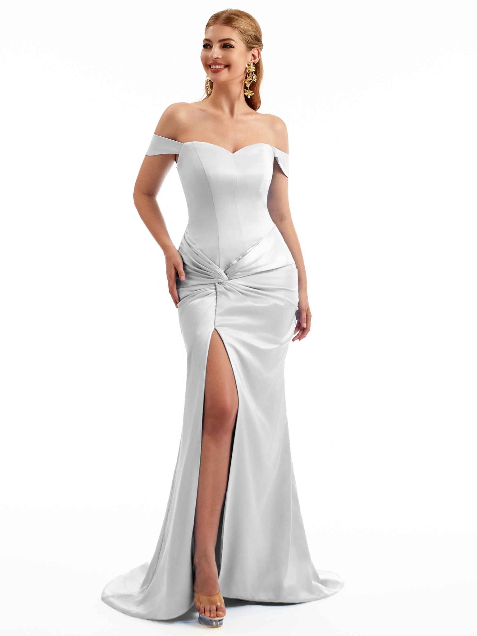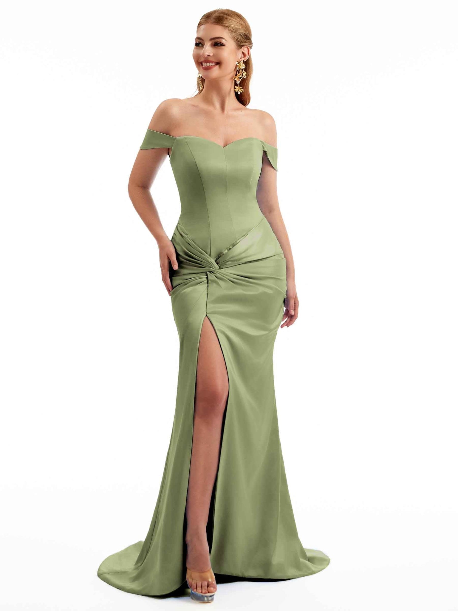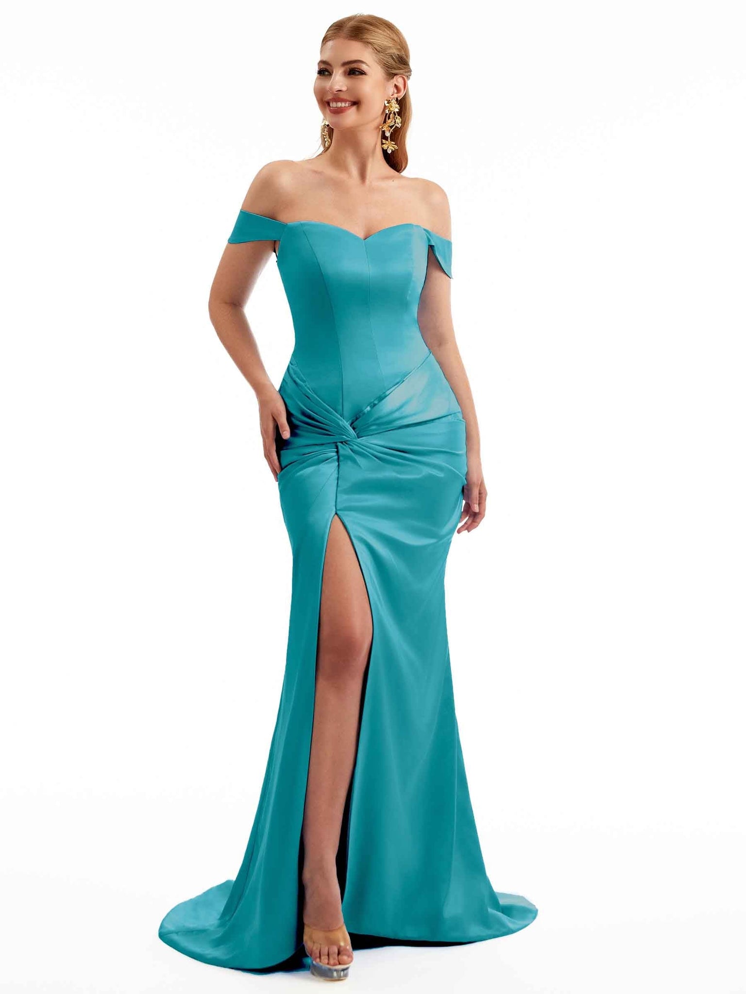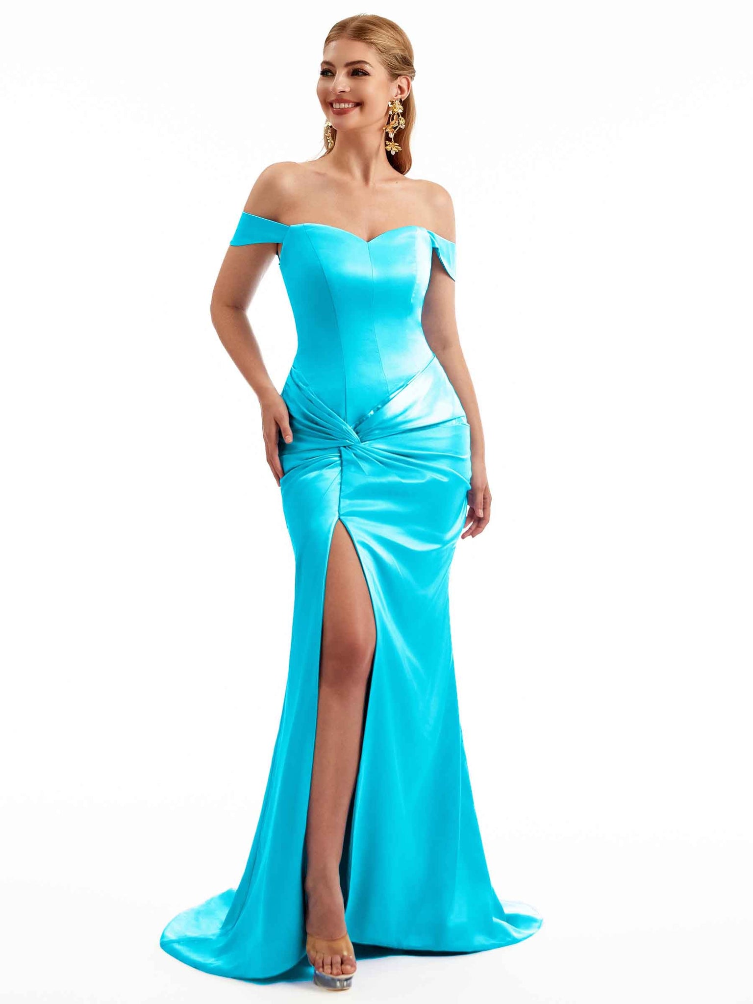 Women Side Split Off The Shoulder Long Boho Chic Satin Bridesmaid Dresses Online